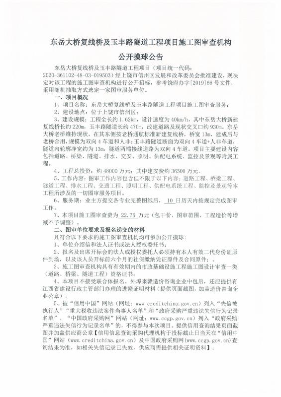 东岳大桥复线桥及玉丰路隧道工程项目施工图审查机构公开摸球公告