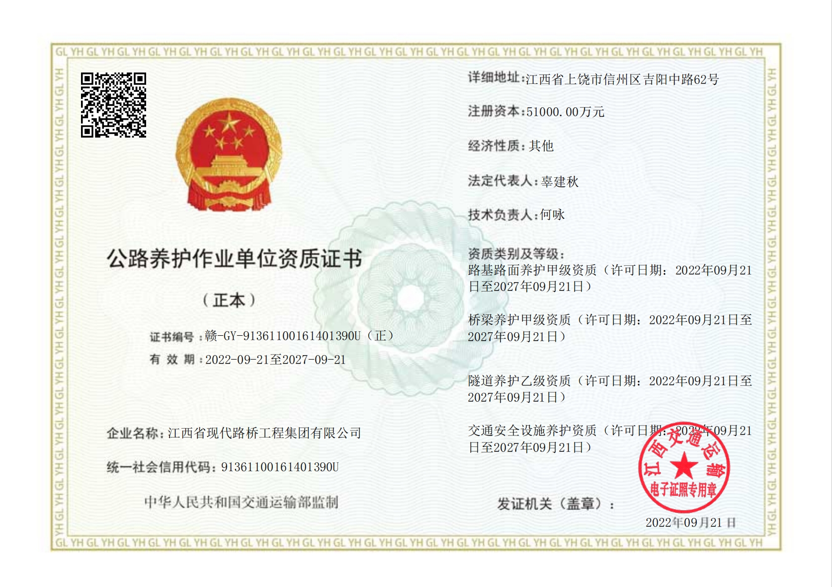 公路养护作业单位资质证书