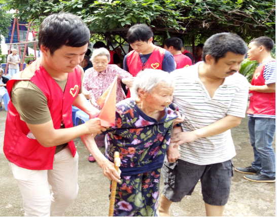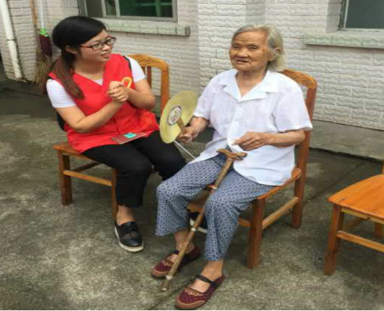 志愿者们陪同老人聊天、发放防暑食品,老人看到志愿者们就像看到自己的子女一样,非常高兴,希望志愿者们经常来看他,陪他聊天。